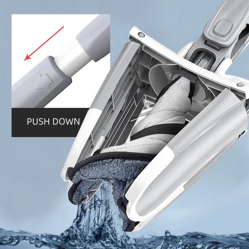 With a simple push of the handle squeezes excess liquid out microfiber pad.