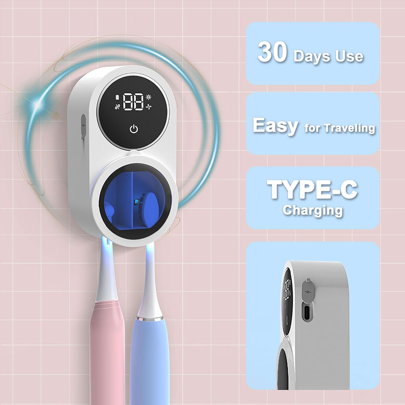 1.Mini Portable Toothbrush Sterilizer: This product is small and portable, convenient for travel or outing use. It is designed for toothbrush sanitizing to ensure oral hygiene on the go. 2. Rechargeable: The product is equipped with a rechargeable battery. It can be easily recharged through the USB port, eliminating the need for disposable batteries and providing long life. 3. Sensor Switch: The product is equipped with a sensor switch that automatically turns on and off when the toothbrush is inserted or removed. Easy to operate, no need to touch. 4. Toothbrush storage rack: The product can be used as a toothbrush storage rack. It keeps toothbrushes organized, protected and readily accessible. 5. With Charging Display: The product has a charging display that shows the battery level and charging status. It allows the user to monitor and ensure that the device is fully charged. 6. UV Travel: This product utilizes ultraviolet (UV) technology to effectively sanitize toothbrushes. It provides a hygienic solution for maintaining oral health while traveling or on the go.